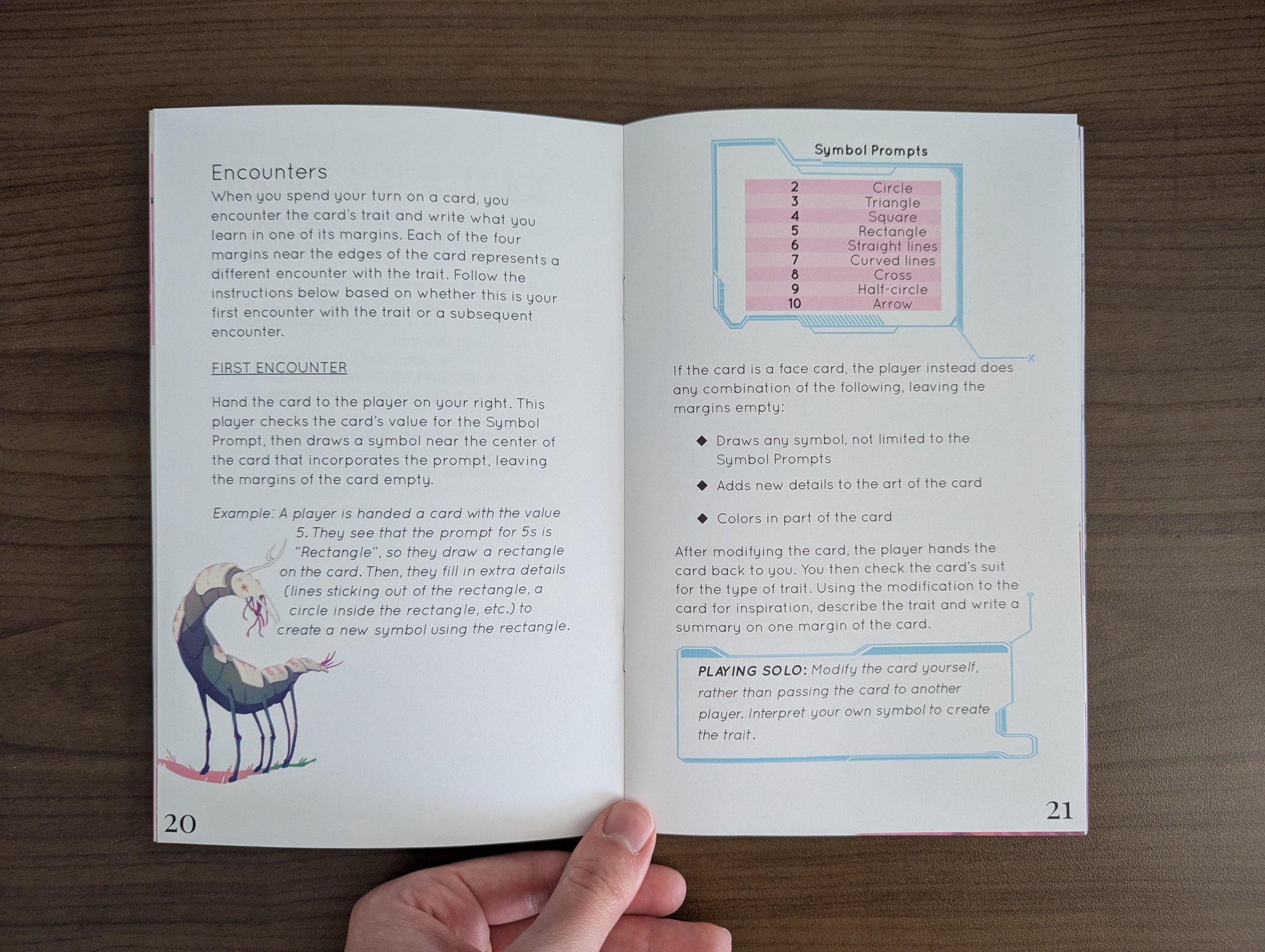 During this casual worldbuilding game, players draw symbols on playing cards to create a planet, populate it with traits, and uncover the mystery of the species that left this world behind. Tell a story of wonder, companionship, and legacy in the midst of a lonely planet.